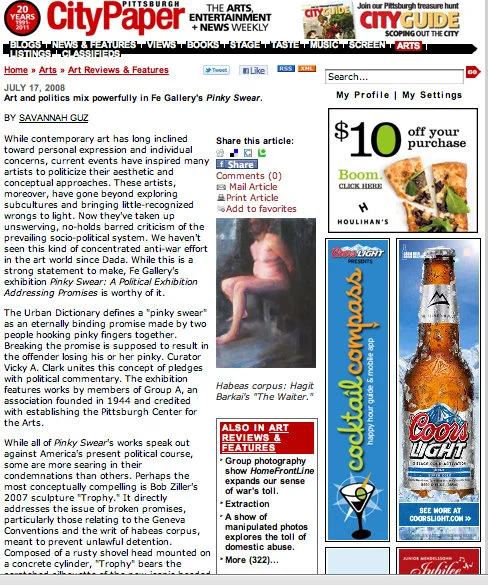 Pinky Swear: A Political Exhibition Addressing Promises continues through Aug. 1. Fe Gallery, 4102 Butler St., Lawrencevillle. 412-860-6028